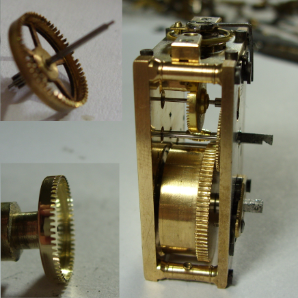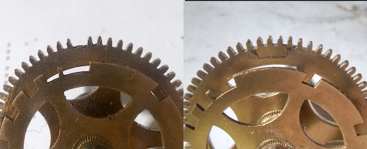 No exemplo ao lado, uma engrenagem cilíndrica com muitos dentes danificados foi copiada com sucesso para o conserto de um antigo relógio tipo carriage.